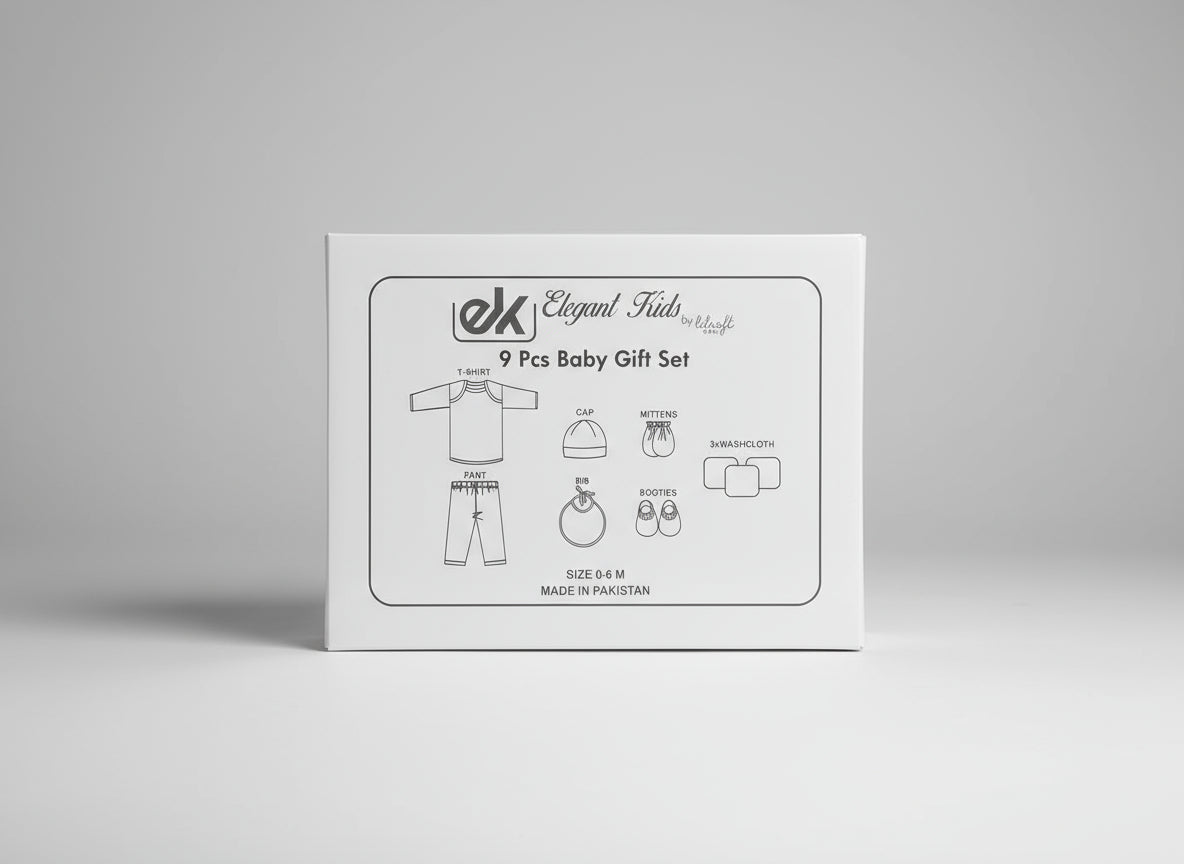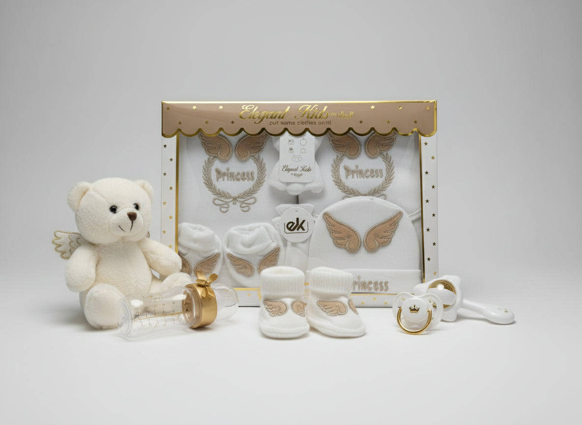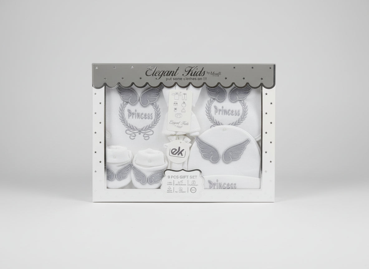 Celebrate your little angel’s arrival with the Elegant Kids 9-Piece “Princess” Newborn Gift Set, designed with love and crafted from soft, breathable cotton for ultimate comfort. Each piece features elegant silver gold embroidery and delicate angel wing details, adding a royal touch to your baby girl’s wardrobe.