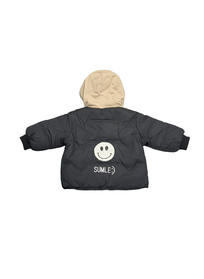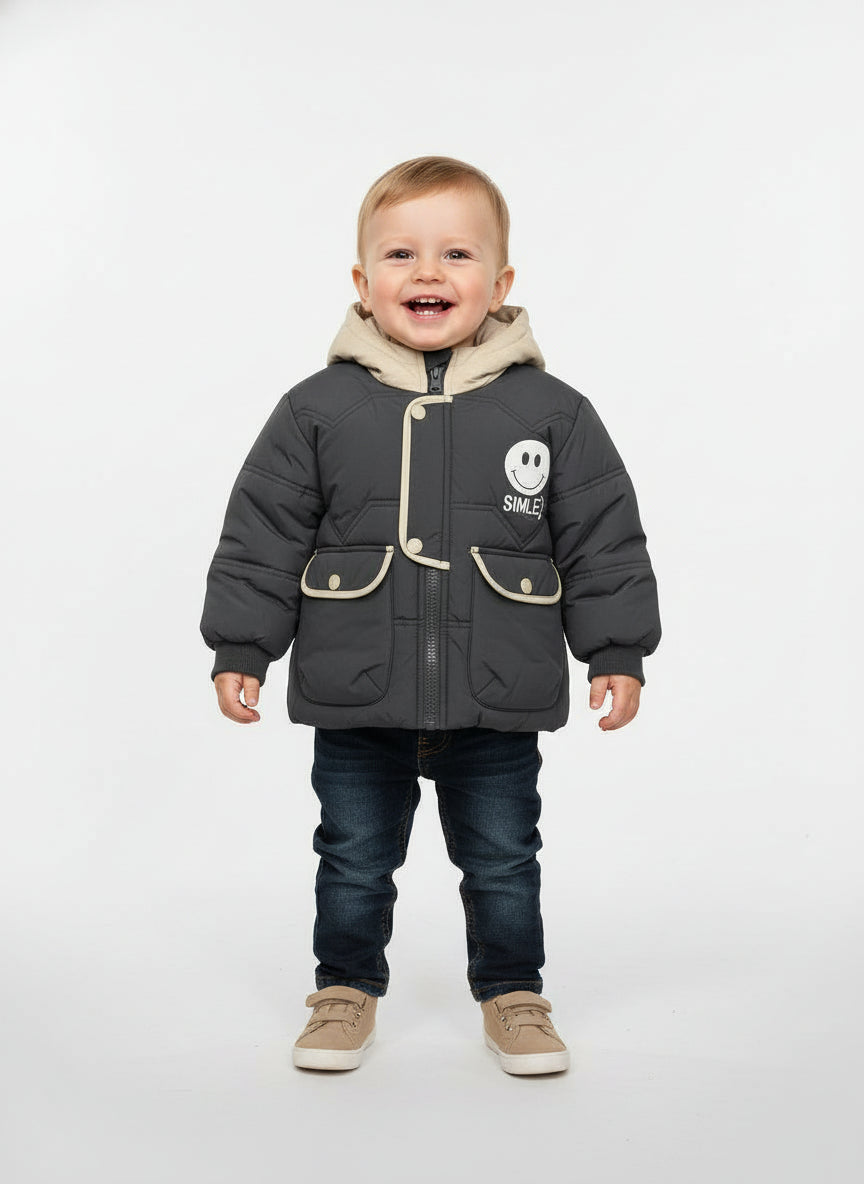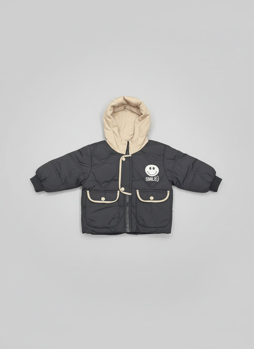 Cozy padded winter jacket with soft hood and cute smile patch, perfect for keeping your little one warm and stylish all season.