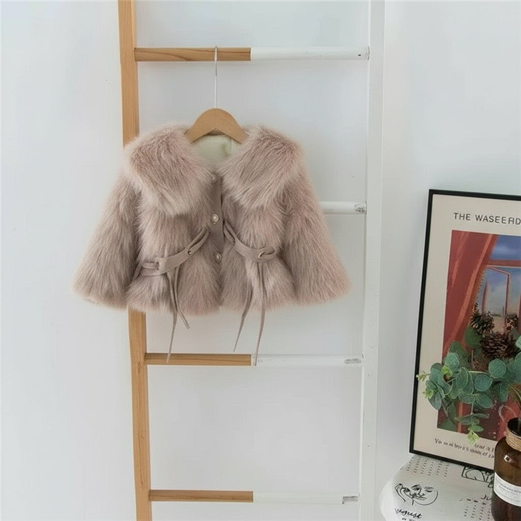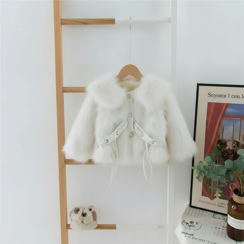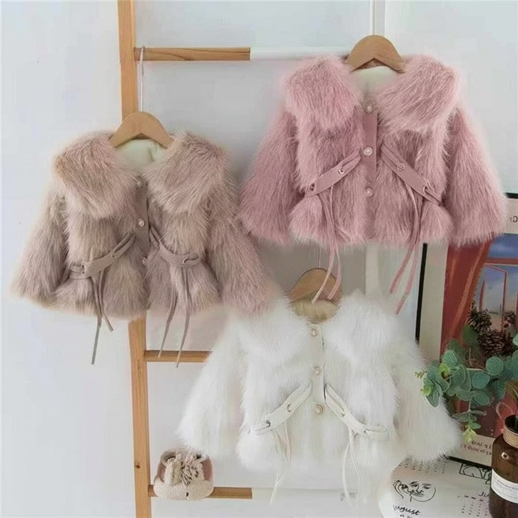 These elegant faux fur jackets are perfect for adding a touch of charm and warmth to your little girl’s winter look. Featuring soft, fluffy texture, button-down front, and a cute belt design — available in pink, beige, and white for ages 6 to 12 years.