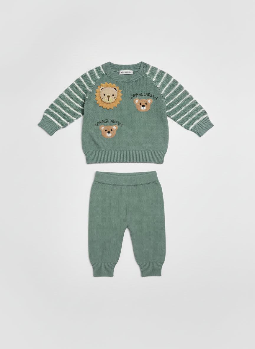 Soft, warm and super cute! This knitted shirt and pants set features adorable lion and bear patches with striped sleeves for a stylish winter look. Made from gentle, stretchable yarn that keeps baby cozy without itching. Perfect for daily wear, outings and photos. Easy to wash, comfortable to wear. 🧸🦁✨