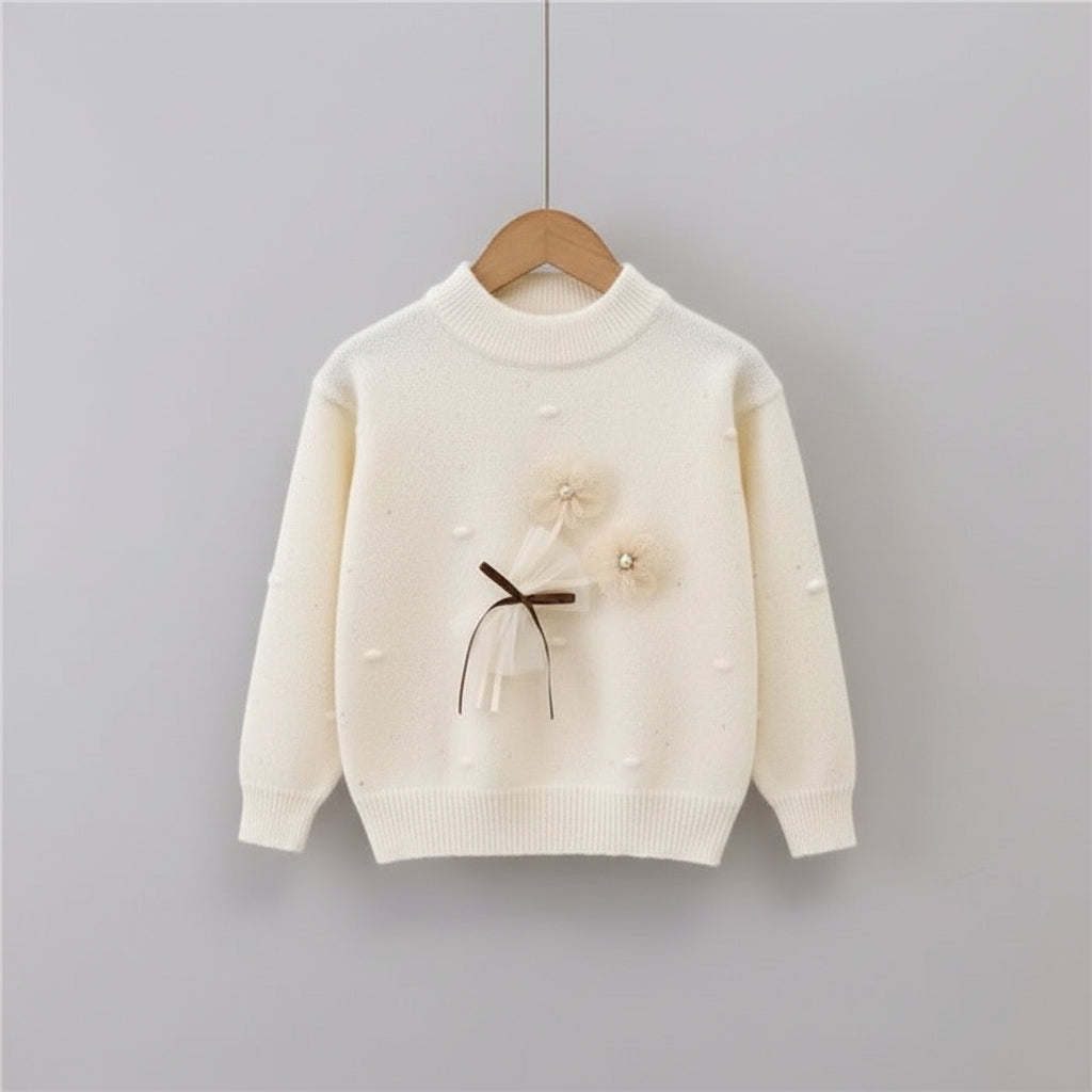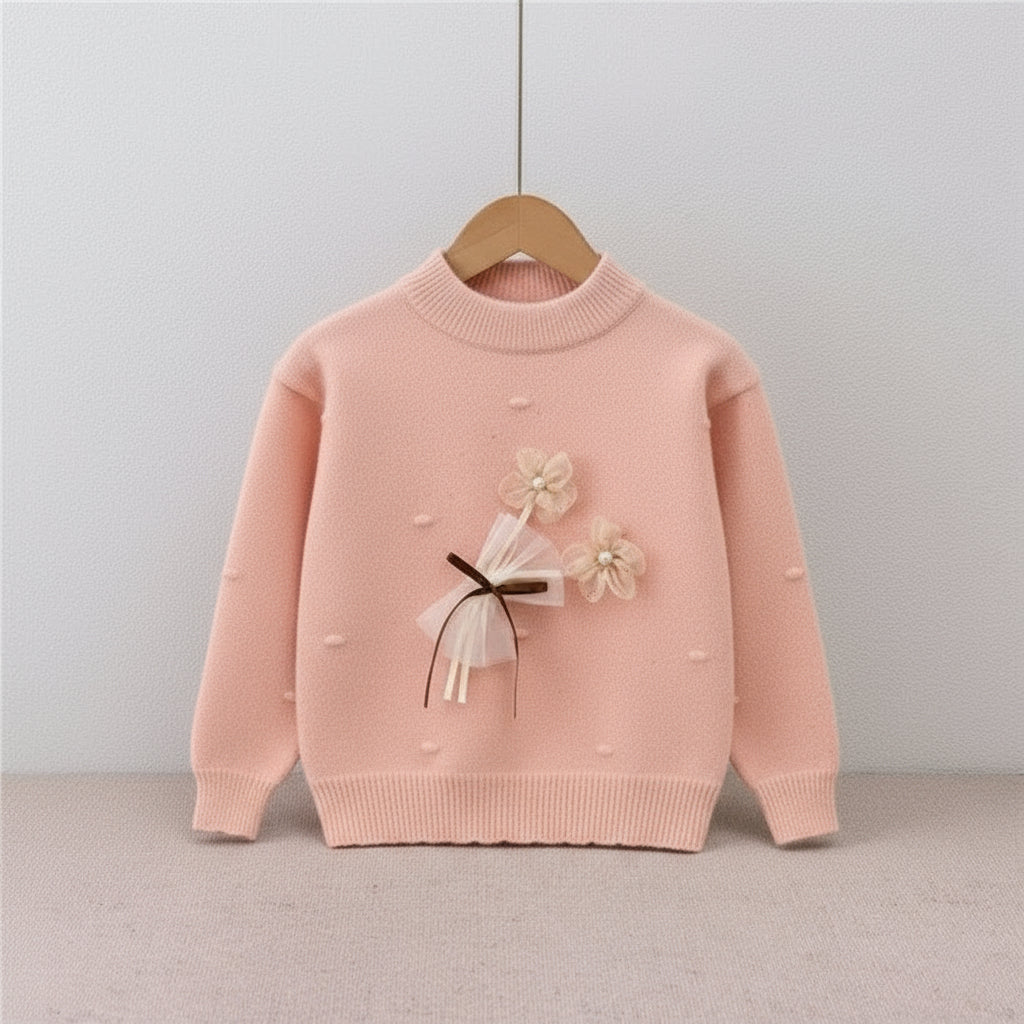 “Soft and cozy winter knit sweaters for girls, featuring delicate floral bow decorations and a warm, comfortable fit — perfect for chilly days with a touch of style.”