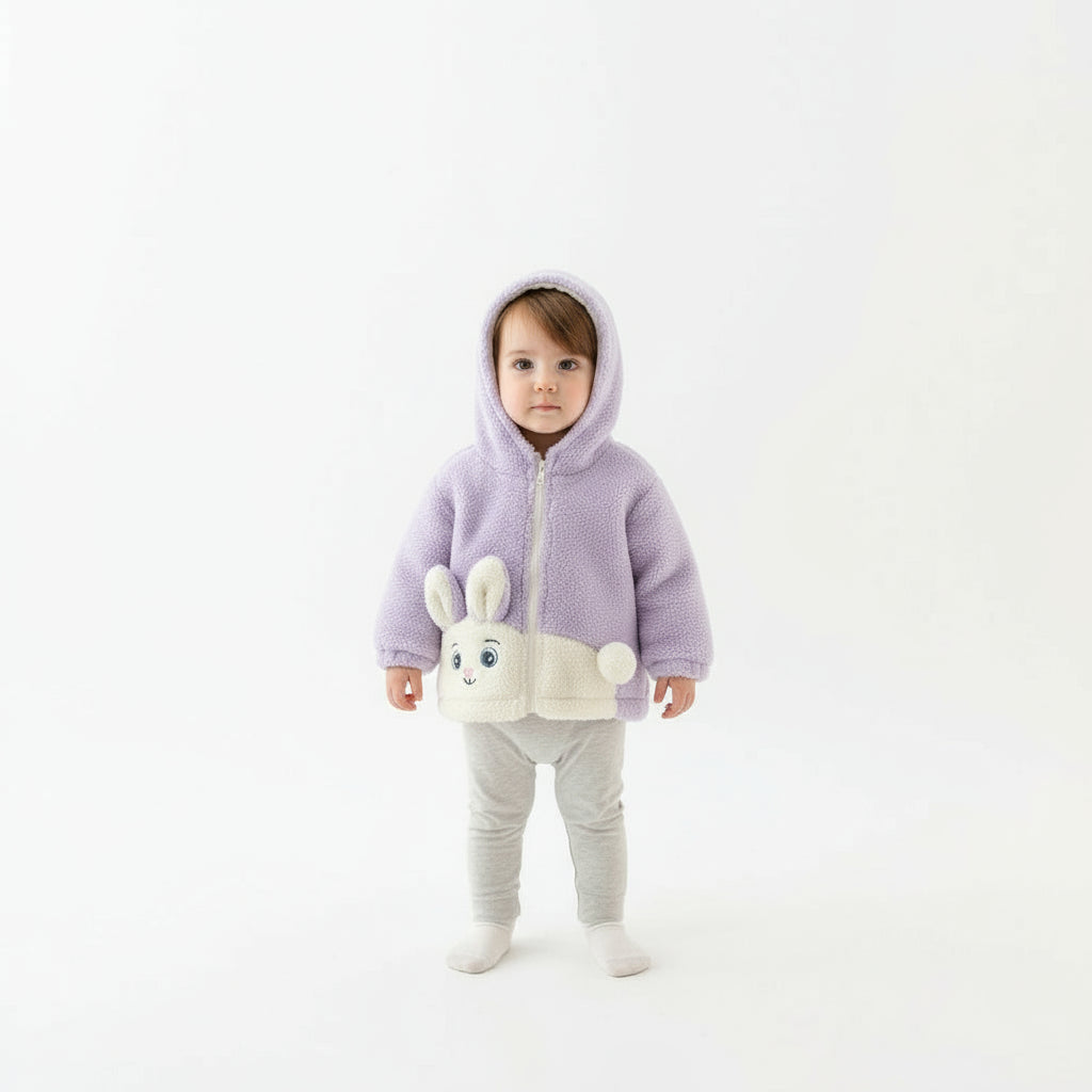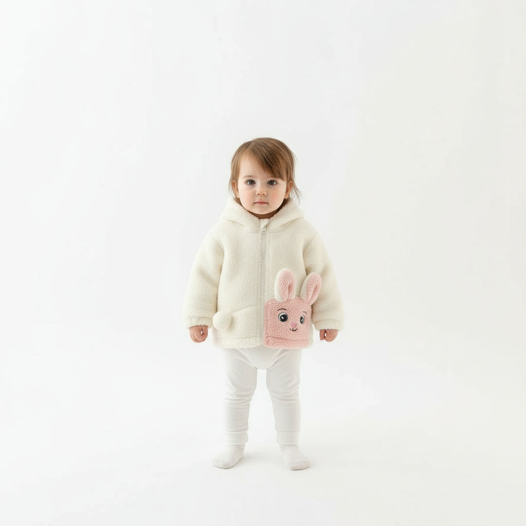 Soft fleece bunny jacket with adorable ears and pocket design — perfect for keeping your little one warm and cozy.